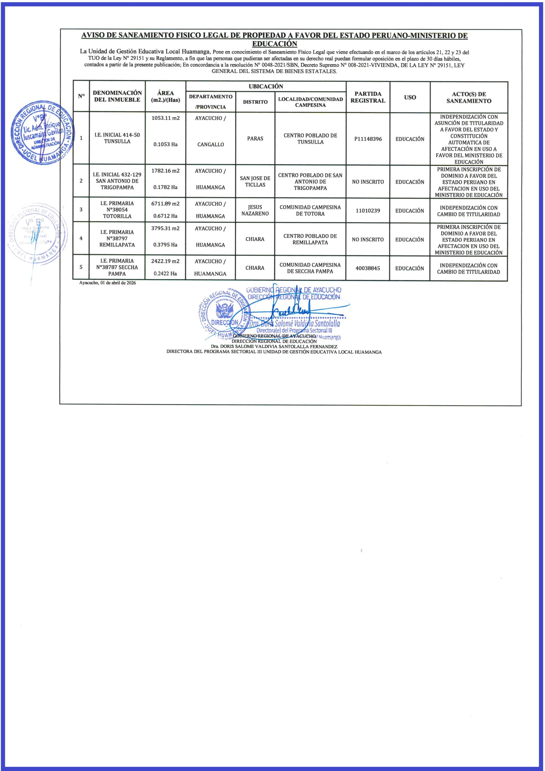 AVISO DE SANEAMIENTO FISICO LEGAL DE PROPIEDAD A FAVOR DEL ESTADO PERUANO – MINEDU